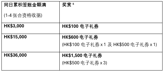 - 同日签帐是由K11 MUSEA 之商户同日发出的最多4张合资格收据计算。所有签帐须以同一张合资格恒生信用卡进行交易(每张收据金额最少为HK$50 , K Dollar及/或K11 实体/电子礼券作消费者金额除外)