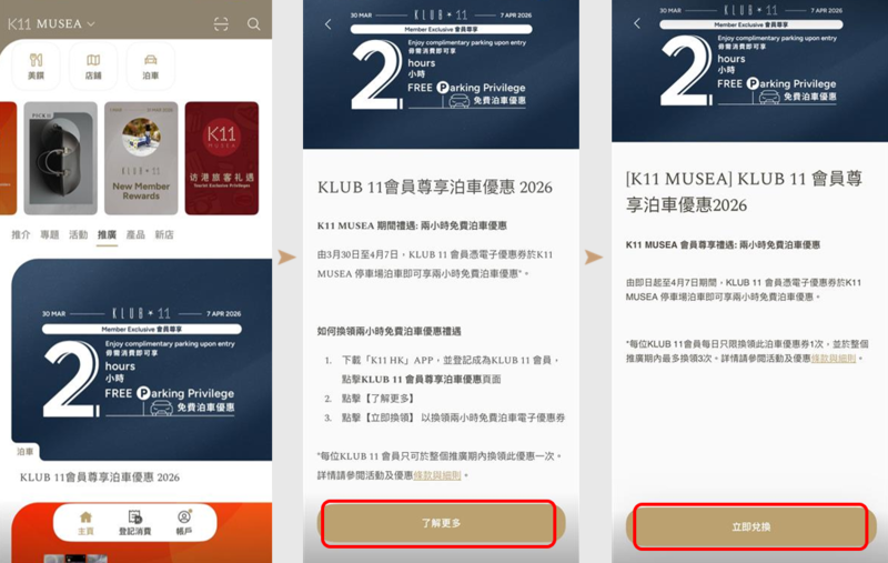 - 下載「K11 HK」APP,並登記成為KLUB 11 會員,點擊 KLUB 11 會員尊享泊車優惠頁面